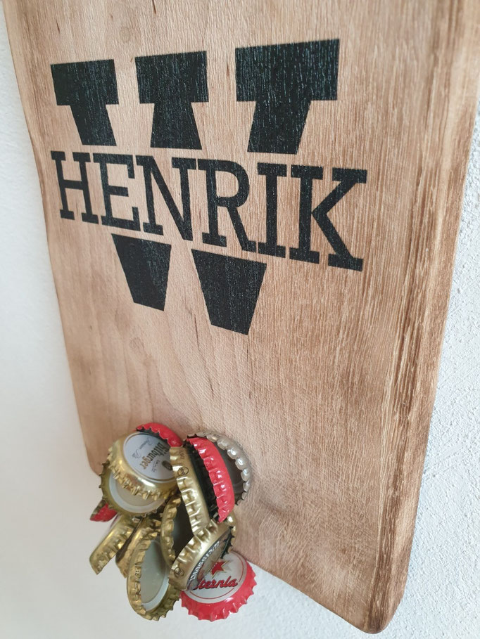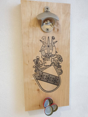 Wandflaschenöffner mit Powermagnet. Material Birke Multiplex 23mm. Inclusive Aufdruck/Text nach Wunsch.
