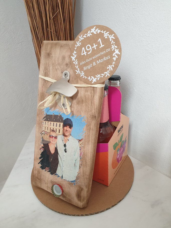 Wandflaschenöffner rustikal, inclusive Branding/Foto nach Wunsch. Höhe 33 cm, Breite 15 cm. Holzstärke 2,5 cm. Massiv Birke.